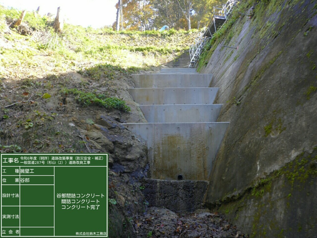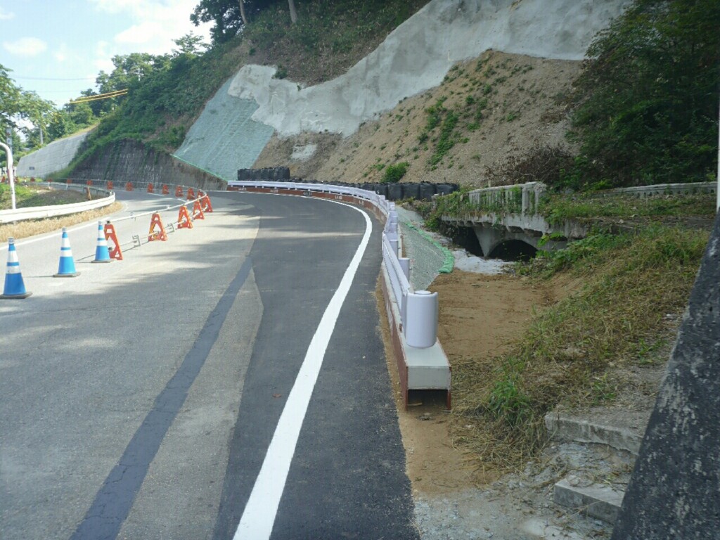 令和8年3月に一部完成検査を実施し、主に仮設工(迂回路土工、迂回路法面工、迂回路舗装工、土留・仮締切工)及び擁壁工(谷部間詰コンクリート)の工事目的物の引渡しが完了しました。